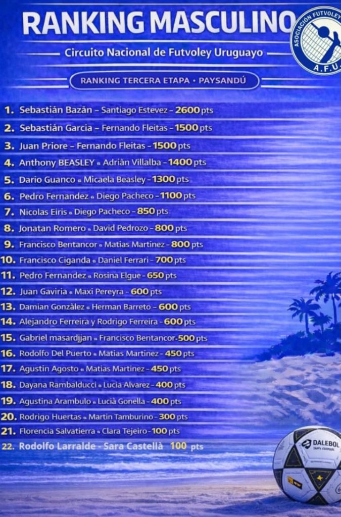 Dos parejas sanduceras serán de la partida mañana en el Estadio Arenas del Plata de la capitalina playa Pocitos, donde se vivirá la última fecha del Circuito Nacional de futvoley. Juan Gaviria y Maximiliano Pereyra, así como Matías Martínez y Francisco Bentancor, son las duplas de Paysandú que formarán parte del cuadro de la competencia, tras la que se cerrará el ranking nacional para definir aspectos importantes.