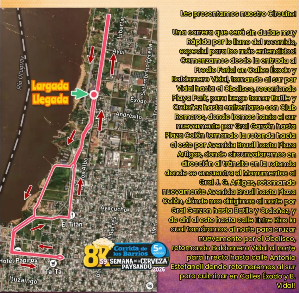 La Corrida de los Barrios vuelve a copar la calle y promete meterle ritmo del bueno a la Semana de Turismo. Mañana, desde las 9 de la mañana, el punto de encuentro será frente al anfiteatro, en la intersección de Éxodo y Baldomero Vidal, con largada y llegada en el mismo lugar.