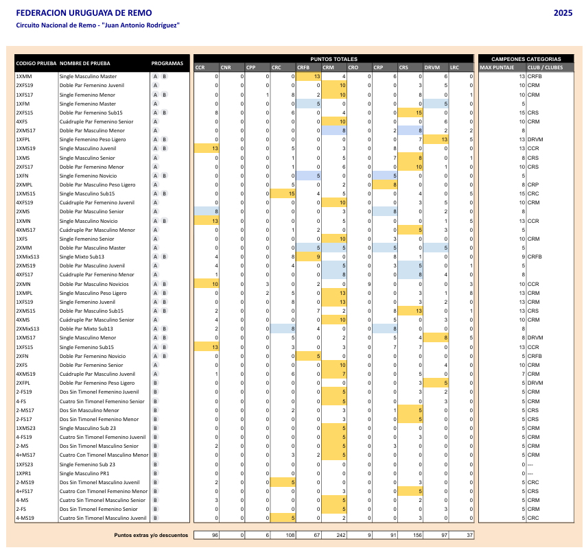 El segundo puesto de la tabla al momento es para el Club Remeros Salto con 156 unidades, y el tercer lugar del podio es para el Carmelo Rowing con 108. Más atrás están ubicados el Alemán de Remo con 97, Colonia Rowing con 96 y el Remeros Paysandú con 91, completando los seis primeros puestos.