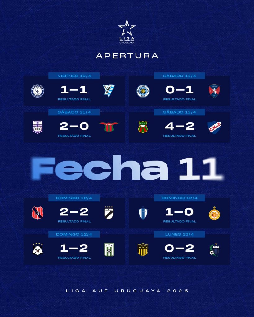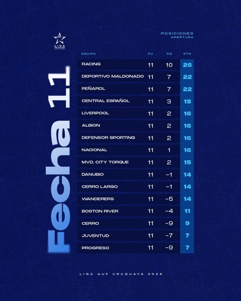 La 11ª fecha del Torneo Apertura del fútbol uruguayo dejó movimientos importantes en la tabla y confirmó una tendencia: Racing se consolida como líder, mientras sus perseguidores inmediatos no logran recortar diferencias de forma decisiva.