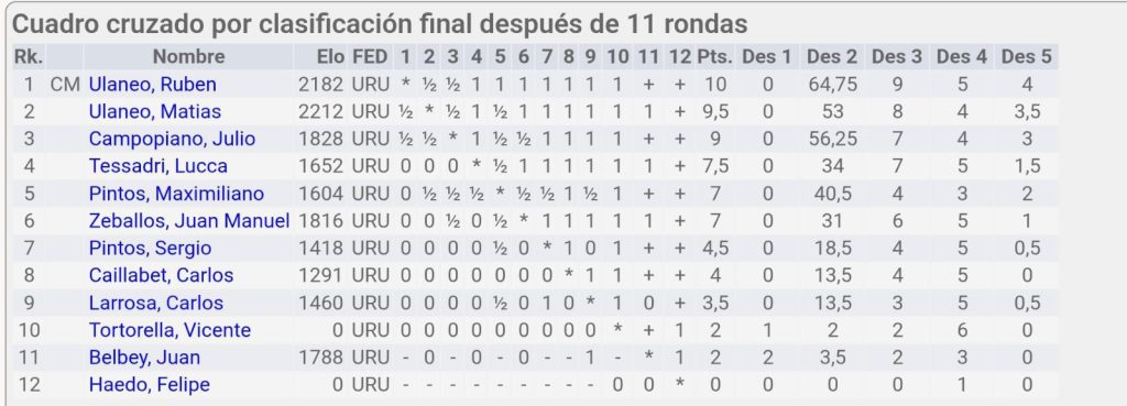 Tras 11 rondas el Candidato a Maestro Ruben Ulaneo se consagró campeón del Departamental de ajedrez, disputado a 11 rondas con partidas de 75 minutos más 30 segundos de incremento por jugada.